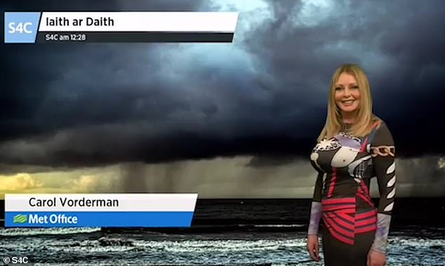 Carol Vorderman makes her debut as a WEATHER GIRL as she presents the forecast in a figure-hugging dress… and recites it totally in WELSH
