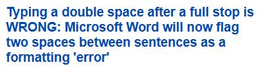 So, the experts have determined that the double space is no longer needed. F*ck ’em! I’ll double space until the day I die. If they don’t like it, they can sit on it and rotate. It was bad enough when they started screwing with the Oxford comma, now they want to reformat paragraph structure just to please some academic’s idea of the “new” grammar? No thank you.