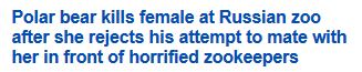 I thought the same thing, that the bear killed a female HUMAN who refused to mate with him. I thought if you’re so ugly a bear tries to get it on with you, you might want to take it where you can get it. Then I said “Eh, Russia”.