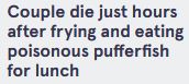 “Couple die just hours after frying and eating poisonous pufferfish for lunch”