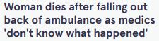 Woman dies after falling out of an ambulance? Either the door latch broke or the EMS folks didn’t secure the doors. It’s not rocket science folks.