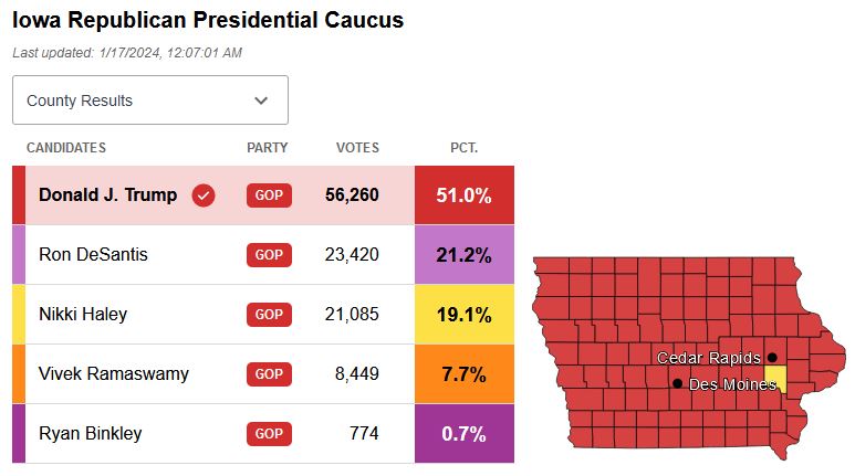 That’s Johnson County where Nikki stomped all over Trump with a decisive margin of victory of Zero Point Zero Three Percent of the vote. ( 35.52 % to 35.49% ) but it is after all the home of the 3rd largest city in Iowa of 150,000 +_ people. ( the 95 other counties are all about 10,000 of less spread out over the 500 square mile counties. Iowa – OCD Heaven for map makers. )