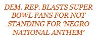 That Black National Anthem crap was the last straw for me. Congressman Cohen actually had the gall to say it was disrespectful for fans not to stand for it. I think Cohen, the NFL and the racist blacks who foisted that bilge on millions of viewers were disrespectful to a majority of Americans who believe there is and should be one nation, with one national anthem.