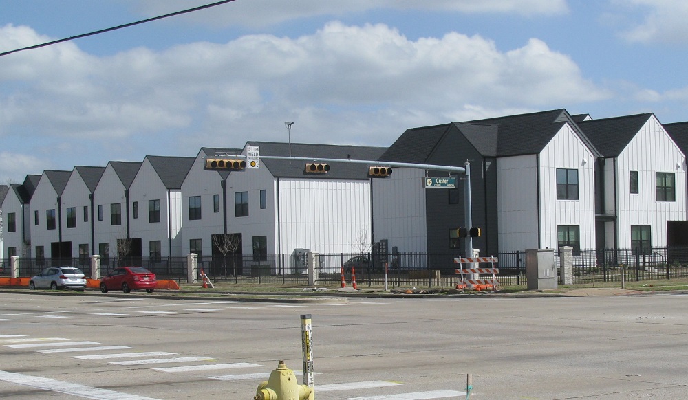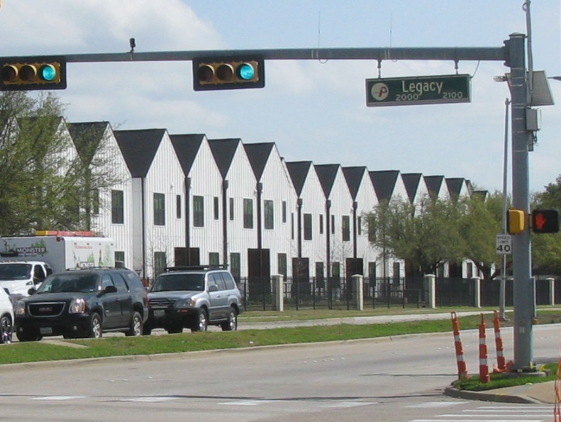 Those architectural pustules are townhouses, and in the normal course of events they’d lie empty for decades; but sadly, there is such great demand for new housing hereabouts (Californians, uh-huh, uh-huh) that I think the houses were almost all sold before completion. Yes, they look like nothing more than white-painted Monopoly houses all crammed together, and to say that they look nothing like any other townhouse development in Plano is an understatement. These are a block or two away from my place:
