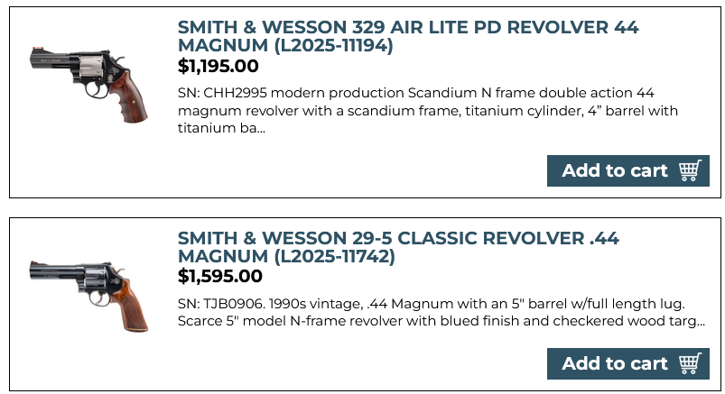 And here’s my question:  why on earth would anyone want a lightweight snubnosed revolver in .44 Mag?  And that especially when the entries are literally one after the other, and the prices are more or less the same?