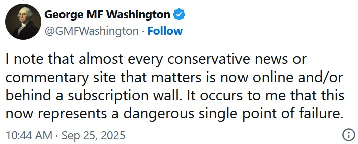 TANSTAAFL, and we conservatives are not freeloaders — except that when our exposure to news is slowly disappearing into the coils of a paywall python, that is not a healthy thing.