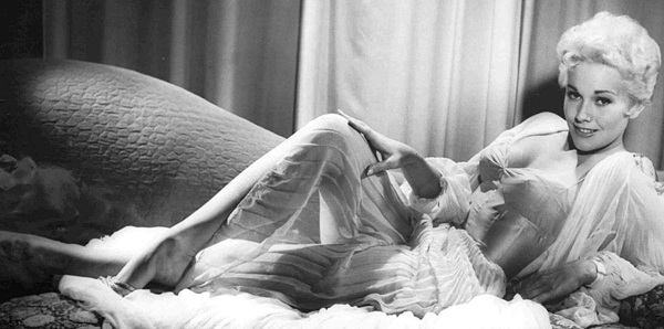 What I like most about Kim Novak is not just her astonishing beauty — that alone would get her onto this back porch of mine — but also the fact that she was a wonderful actress, right out of the gate of her first movie. Award followed award, but because she was also determined not to be screwed by Hollywood, she often fought with the studios who wanted to underpay her and / or play the stereotypical part of The Cute Little Blonde (which she utterly refused to allow). And she mostly won.