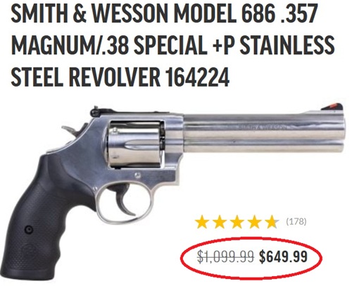 Reader Brad_In_IL suggests that Palmetto State Armory has an overstock of the excellent S&W Model 686; that, or they’re just using it as a loss leader — the retail term that is used to describe an advertising campaign which features a product at a ridiculously-low price to attract customers into the store, where they’ll buy not just the featured loss leader but (hopefully) other products at regular retail prices (which carry higher profit margins).