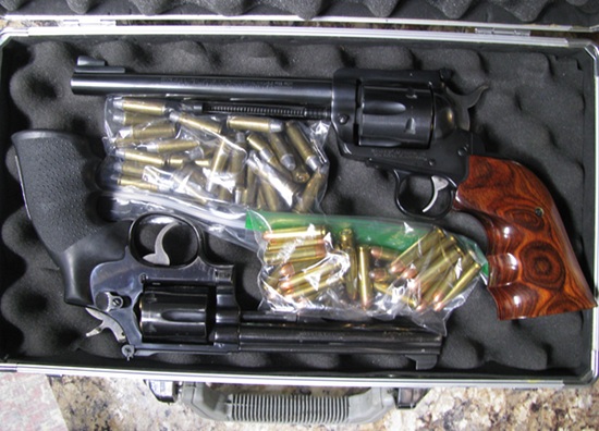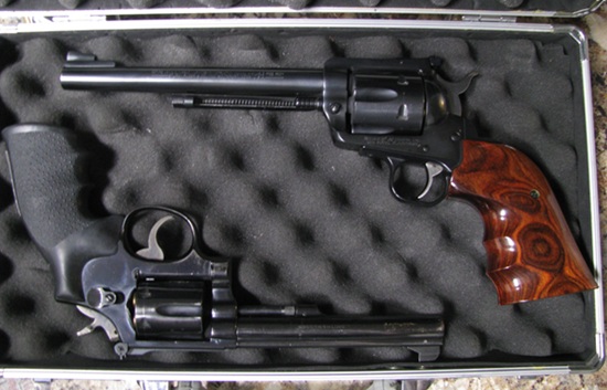The top gun is my much-loved Ruger Super Blackhawk 7″ barrel, in .30 Carbine, and the lower is the late Layabout Sailor’s S&W Model 15 6″ barrel in .38 Special.