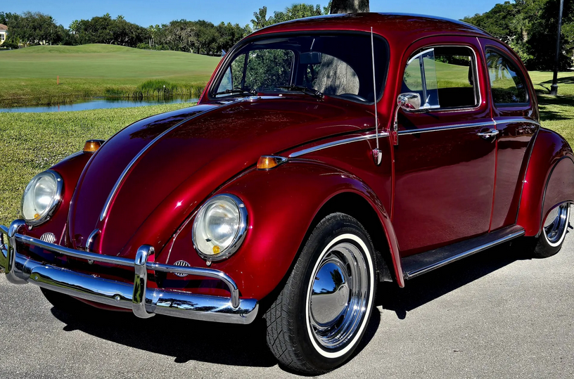 And I love that candy-apple red color and those rear wheel covers.  The only thing missing are the flip-out indicators on the door column, then and now a lovely feature of the Beetle — I’m not sure whether they’d been taken off by 1964, though.